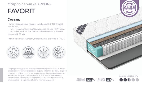 Практичная модель с разной жесткостью сторон по доступной цене. Применение пенополиуретана стандартной марки ST 2236 с одной стороны матраса позволяет получить мягкое и комфортное спальное место, которое подстраивается под контуры тела пользователя. Угольная пена высокой плотности с другой стороны делает ее более жесткой и упругой, лучше распределяет весовую нагрузку. Использование термовойлока продлевает срок службы наполнителей.