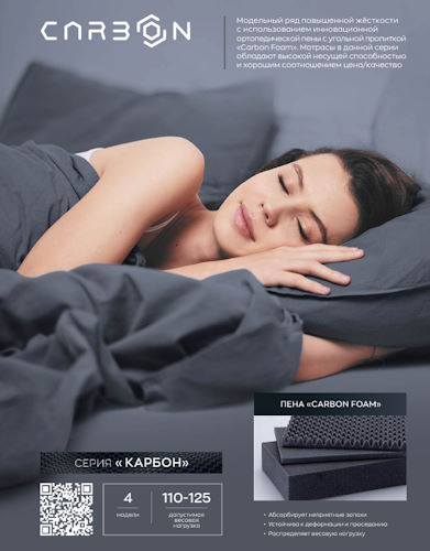 Доступный беспружинный матрас с разной жесткостью сторон. Подойдет тем, кто любит «спартанские условия» во время сна. Сочетание угольной пены с жестким наполнителем «Bicotton» придает одной из сторон высокую жесткость. Другая сторона с пенополиуретаном стандартной марки будет иметь среднюю жесткость. Модель комплектуется комфортным трикотажем, хорошо вентилируется и обладает высокими эксплуатационными характеристиками.