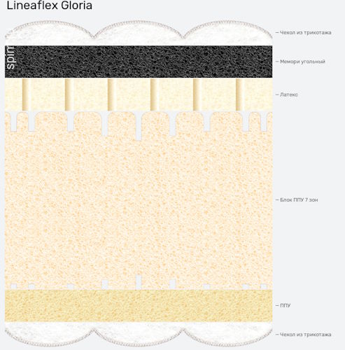 Высота Глории – 30 см. Степень упругости «два в одном». С одной стороны –жесткое покрытие уровня «средний», а с другой – мягкое. Комплектуется несъемным чехлом (полиэстер и вискоза) и «дышащим» материалом 3D SPACE. Стежка – терморегулируемый холлофайбер. Ограничений по весу нет.