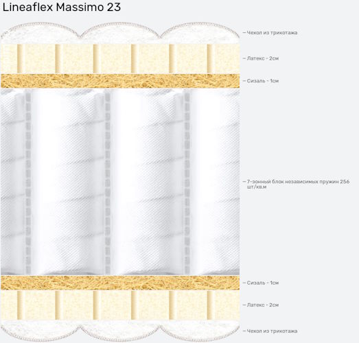 Высота матраса Массимо 23 см. Рекомендуемый вес нагрузки до 140 кг. Комплектуется элегантным съемным чехлом с перламутровым отливом из шелковой ткани TENCEL. Помимо основного нарядного чехла, модель покрыта защитным хлопковым трикотажем, который тоже можно снимать.