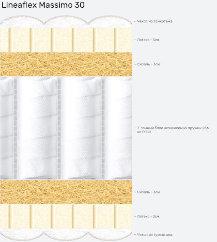 <virtues>Удобный анатомический матрас, качественный и приятный чехол из трикотажа, хорошо держит вес</virtues> <limitations>Конечно цена, довольно дорого, но и с ней можно согласиться, когда уже поспишь на этом чудо-матрасе</limitations> <comment>Весной 2022 года приобрела первый матрас от Линии Флекс - Лилия Люкс, а Массимо уже вторая покупка этой фабрики, его размер 180х200, высота 30 см и заказывали мы его в этом же интернет-магазине матрасов Планета Комфорта. Матрас Лилия Люкс не подошел нам с мужем по жесткости, так как оказался для нас слишком мягким и поэтому он переехал на дачу. Второй матрас я выбирала пожестче и выбор пал на матрас Массимо, его преимущества в том что у него разная жесткость и в составе есть латекс. Цена конечно не доступная, но так как это важная покупка, решили не экономить. Это было лучшее решение, спустя буквально месяц мы с мужем по достоинству оценили этот матрас, очень комфортный, с идеальной жесткостью, совершенно нет никаких недостатков. Когда мы в отъезде, я очень скучаю по своему матрасу, так как самый крепкий сон у меня именно на этом матрасе. Всем кто ищет идеальный матрас, рекомендую обратить на этот матрас Массимо, это мерседес среди матрасов. Ещё хочу отметить сервис, менеджеры настоящие профи, не пытаться втюхать товар подороже, не страдают навязчивостью, но при этом рекомендуют очень правильные сопуствующие товары, например нам посоветовали водонепроницаемые наматрасники, мы как молодые родители их приобрели и спасли наш матрас от нескольких детских неожиданностей. Магазину и матрасу 5 звезд из 5!!!</comment>