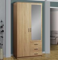 Шкаф 06.290 обладает лаконичным дизайном, однако полноценно обеспечивает потребности пользователей в размещении предметов гардероба. Слева предусмотрено отделение для расположения одежды на плечиках, справа – для хранения вещей в сложенном состоянии на полках. Дополнительное удобство обеспечивают три выдвижных ящика в нижней зоне. Правая укороченная створка оснащена зеркалом.