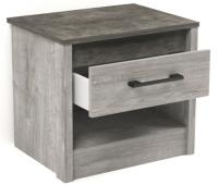 Прикроватная тумба Денвер дополнена открытой полкой и выдвижным ящиком. Шариковые направляющие надежно удерживают ящик при открывании.